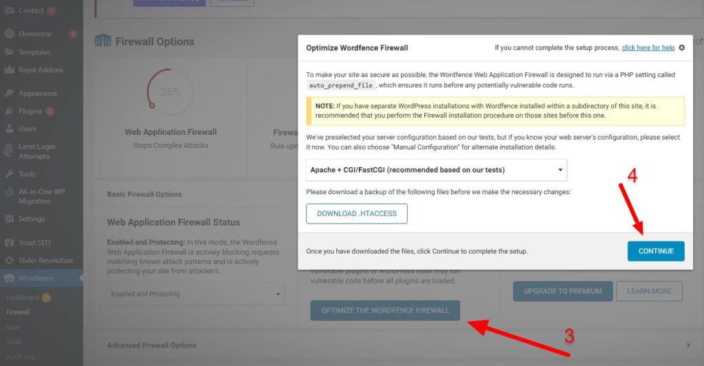 Download the .htaccess backup file when prompted, then click Continue to complete the optimization.
